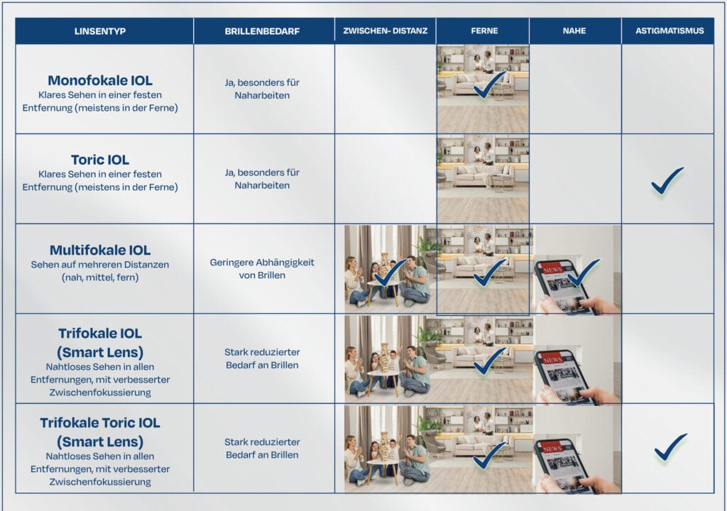 • Individuelle Linsenwahl: Optionen für Nah-, Fern- und Astigmatismuskorrektur